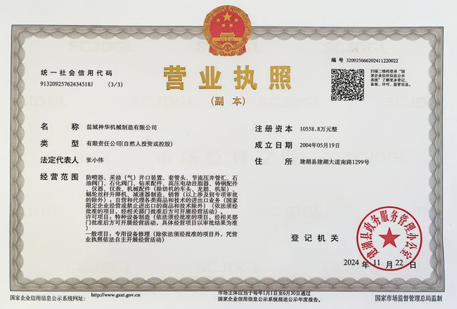 鹽城神華機械制造有限公司為中國石油、石化、海洋物資裝備(集團)總公司的網絡成員單位,公司注冊資金10558.8萬元整,公司通過了ISO9001國際質量體系認證,取得了中國船級社船舶產品和配件使用證書。